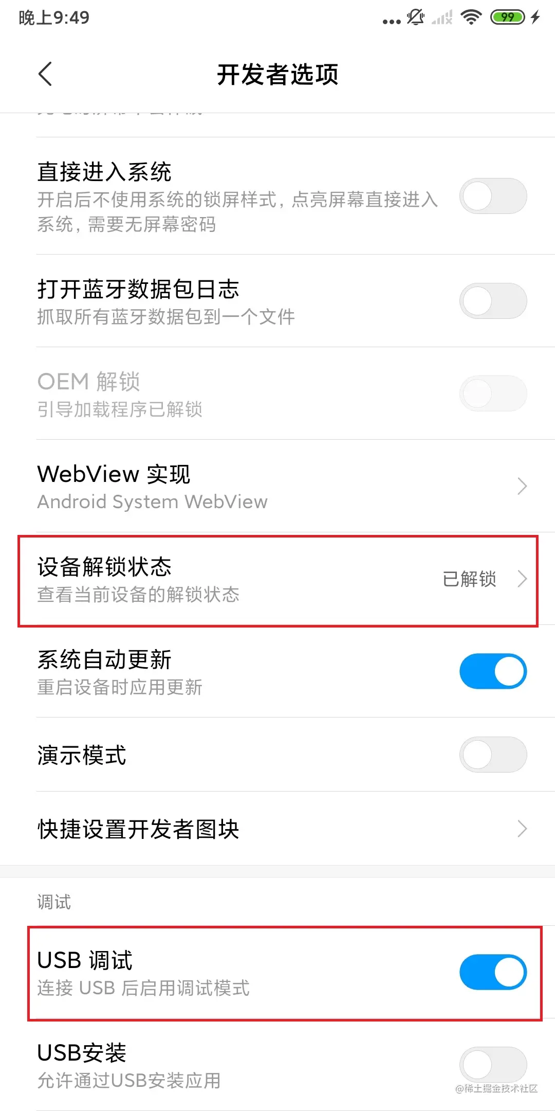 模拟器的话就不需要这步操作了,因为可以直接开启root,真机需要先解锁设备,首先开启开发者选项,然后进入开发者选项,开启USB调试。有部分设备还需要切换USB配置,等待弹窗,允许USB调试。同时可以查看设备解锁状态,未解锁需要先解锁,下载小米解锁工具。