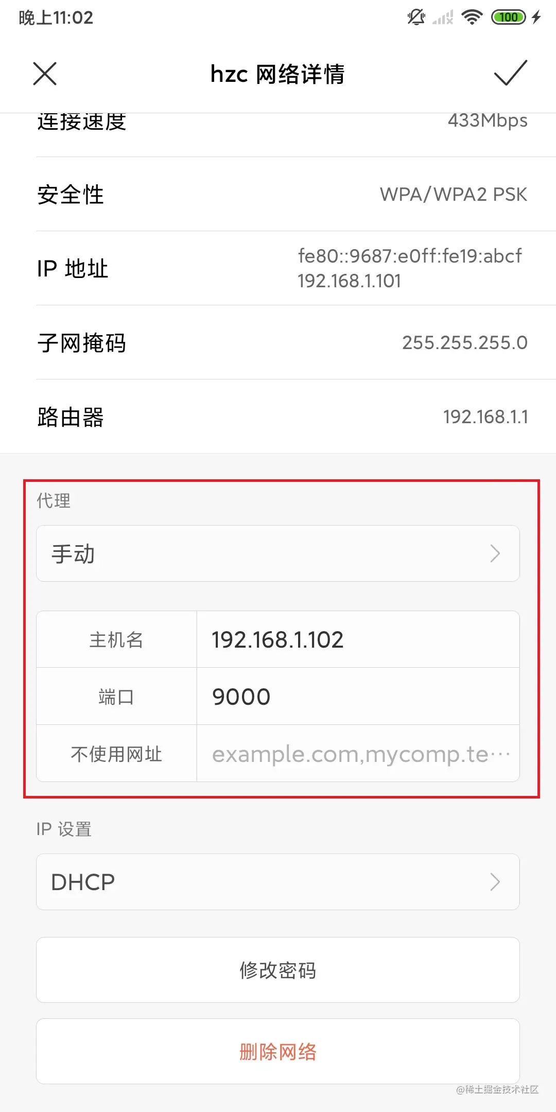 然后到app,连接相同的wift,选择手动设置代理,设置主机名和端口,这里我使用的reqable工具,默认端口为9000,fiddler默认端口为8888,在工具中都可以查看和修改。