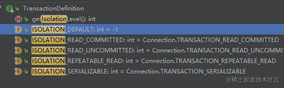 从源码定义我们可以看到,一共有 5 种隔离级别,而 DEFAULT 就是使用数据库定义的隔离级别。
