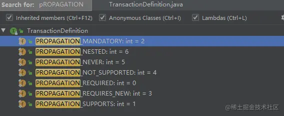 从源码来看,一共有 7 种事务传播行为: