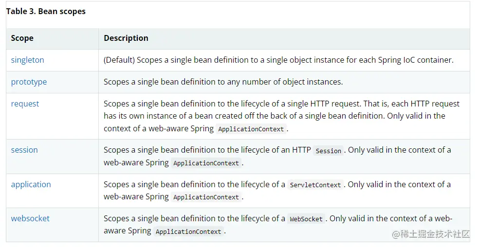 - websocket:一个 WebSocket 生命周期内一个 bean 实例,这种作用域仅存在 Spring Web 应用中