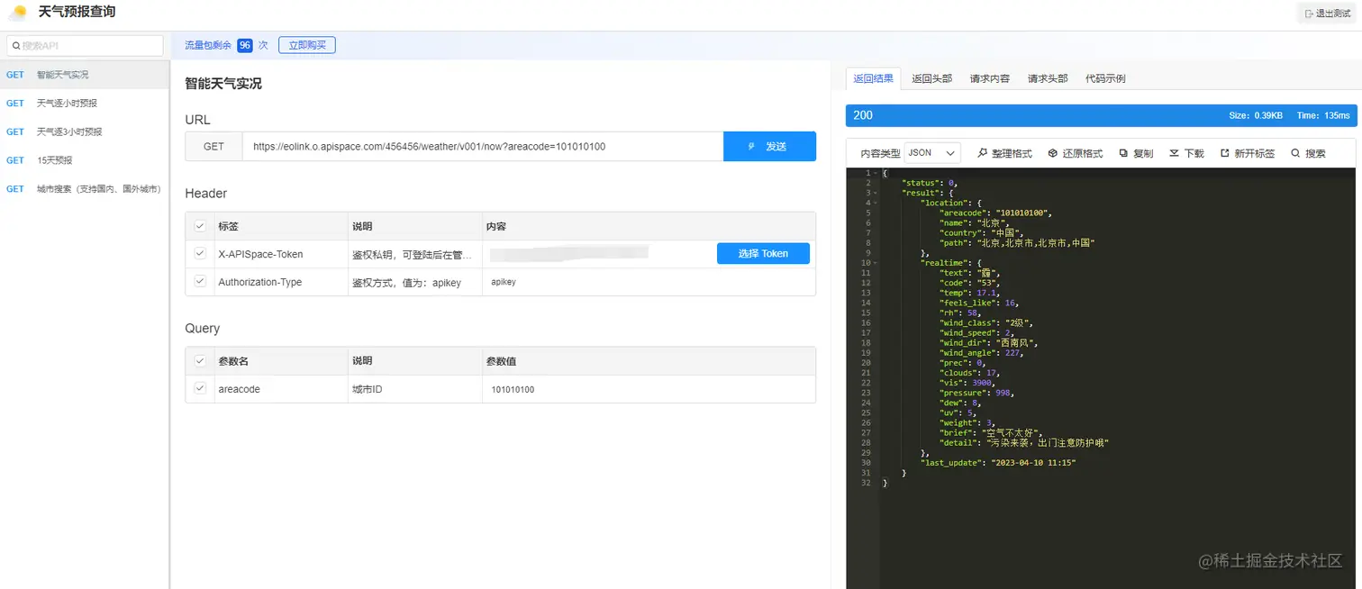 2.在 天气预报查询 API 详情页 中,可以先申请免费次数,然后进行 API 测试,输入城市编码,即可获取该城市的详细天气信息。