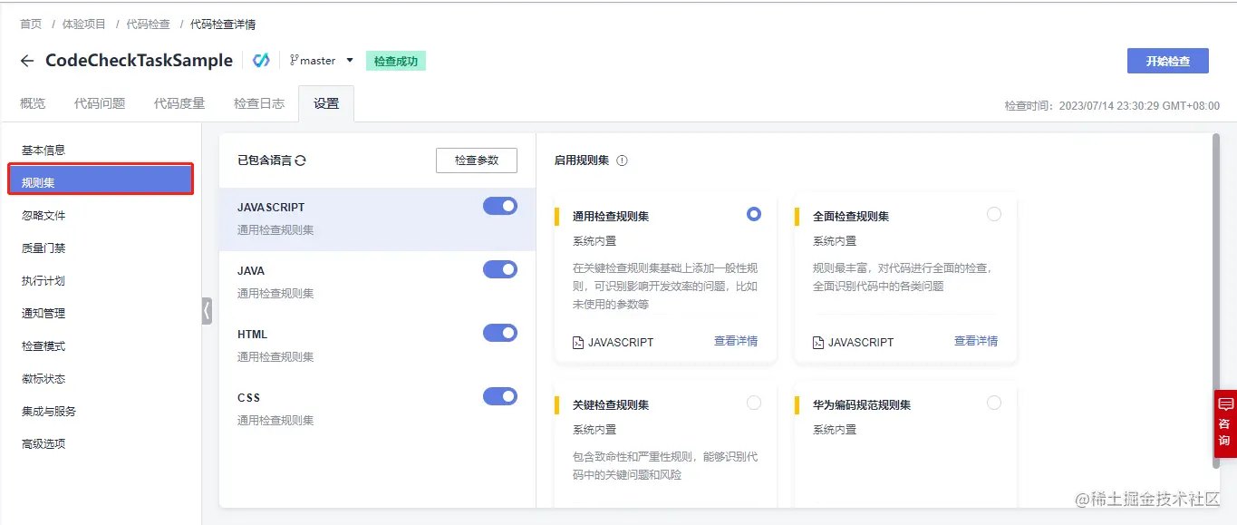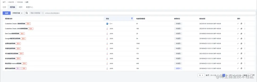 在上面体验项目任务扫描过程中,我们使用的是直接开始检查,代码检查服务会默认使用Java、C++、PHP、C#、JS、TypeScript、HTML、CSS、Go和Python语言的规则集;而我们在实际过程中,可以根据自己的需要新增、复制、修改或删除自定义规则集: