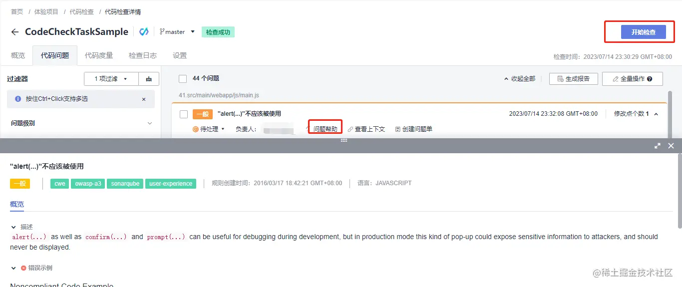如果在修复问题过程中,有不理解此问题或者需要修复帮助时,可以点击问题下的“问题帮助”查看此告警的详细描述、正确示例、错误示例、修复建议等信息, 在我们修复完所有问题后,可以继续点击“开始检查”按钮检测是否成功修复;