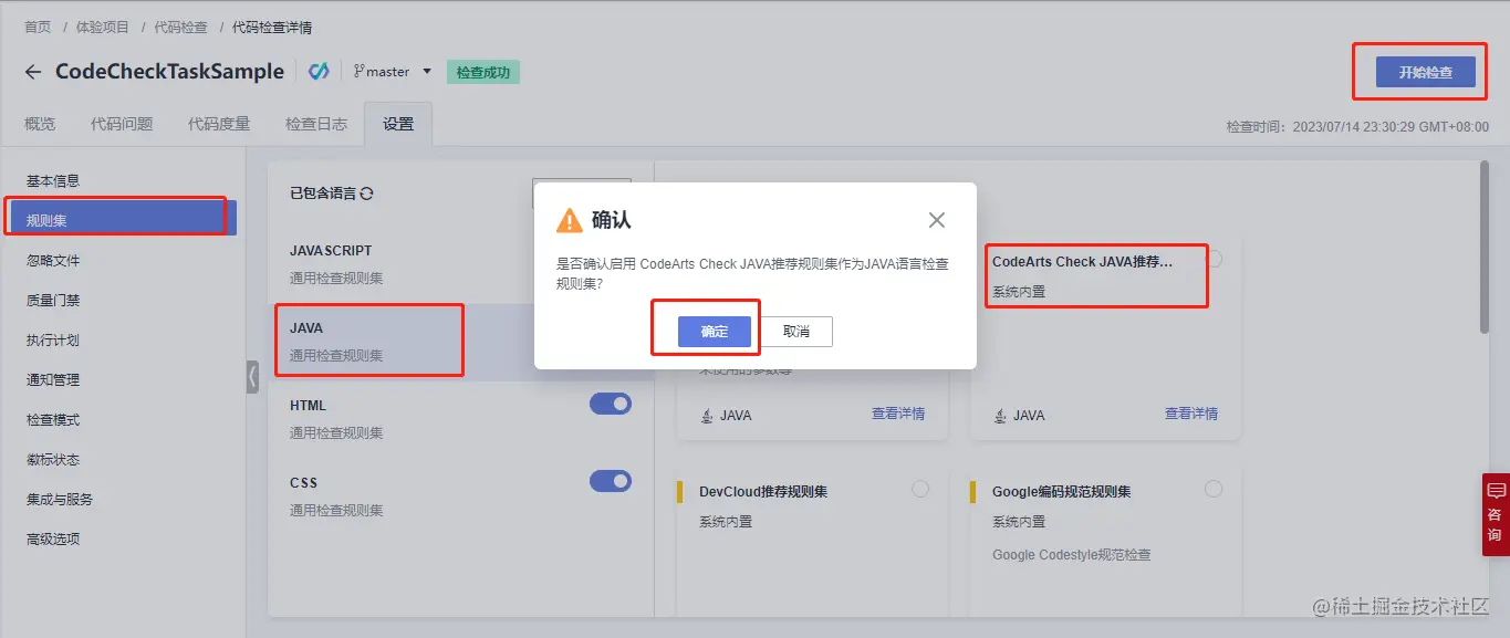 点击左侧JAVA语言查看其包含的所有规则集,可以启用其中的某种规则再次选择“开始检查”来扫描此任务(启用后,默认使用这一种规则集进行扫描):