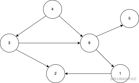 在图论中,如果一个有向图从任意顶点出发无法经过若干条边回到该点,则这个图是一个有向无环图(DAG,Directed Acyclic Graph)。下图中,4→6→1→2是一条路径,4→6→5也是一条路径,并且图中不存在从顶点经过若干条边后能回到该点,这种图就可以称为有向无环图。