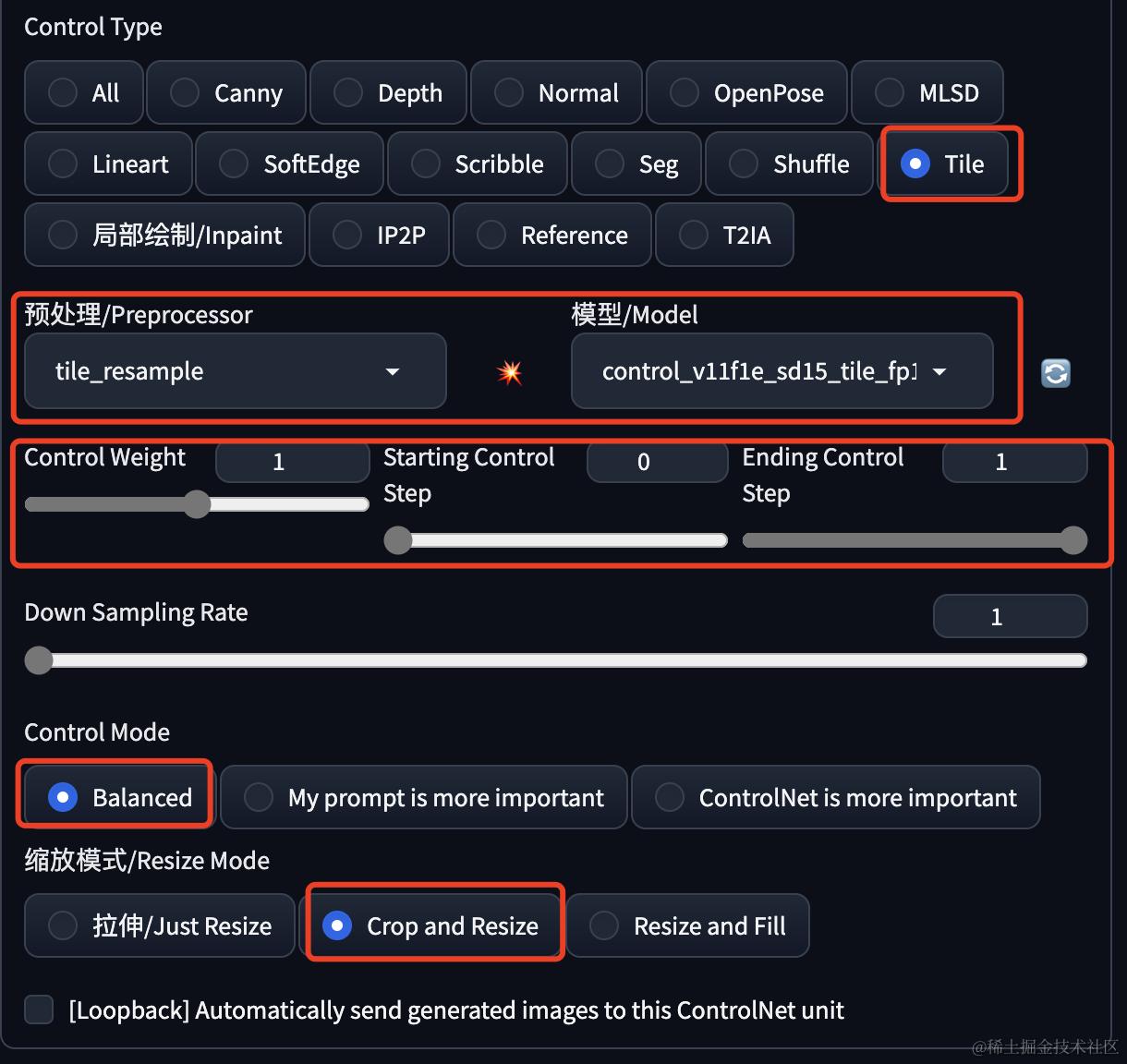 这里选择Control类型为 Tile,注意预处理器和模型都要对应上,都是包含tile的,一般WebUI会自动选择上,没有自动的需要自己选择;