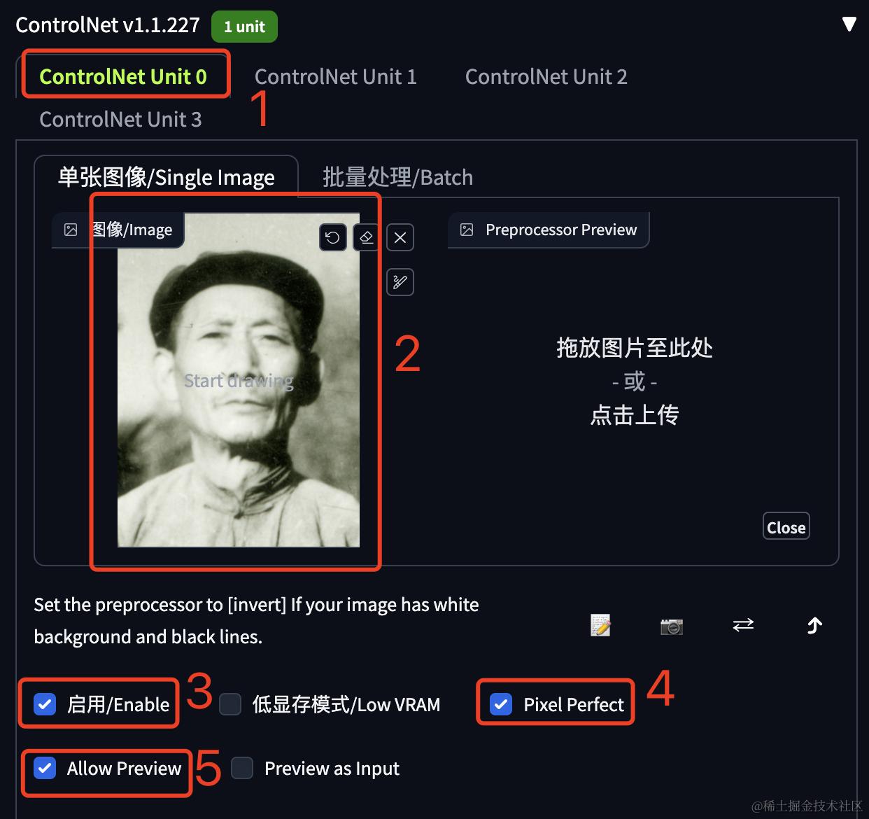 在第一个Unit中上传原图;勾选“启用”,否则ControlNet不生效;勾选“Pixel Perfect”,勾选“Allow Preview”。