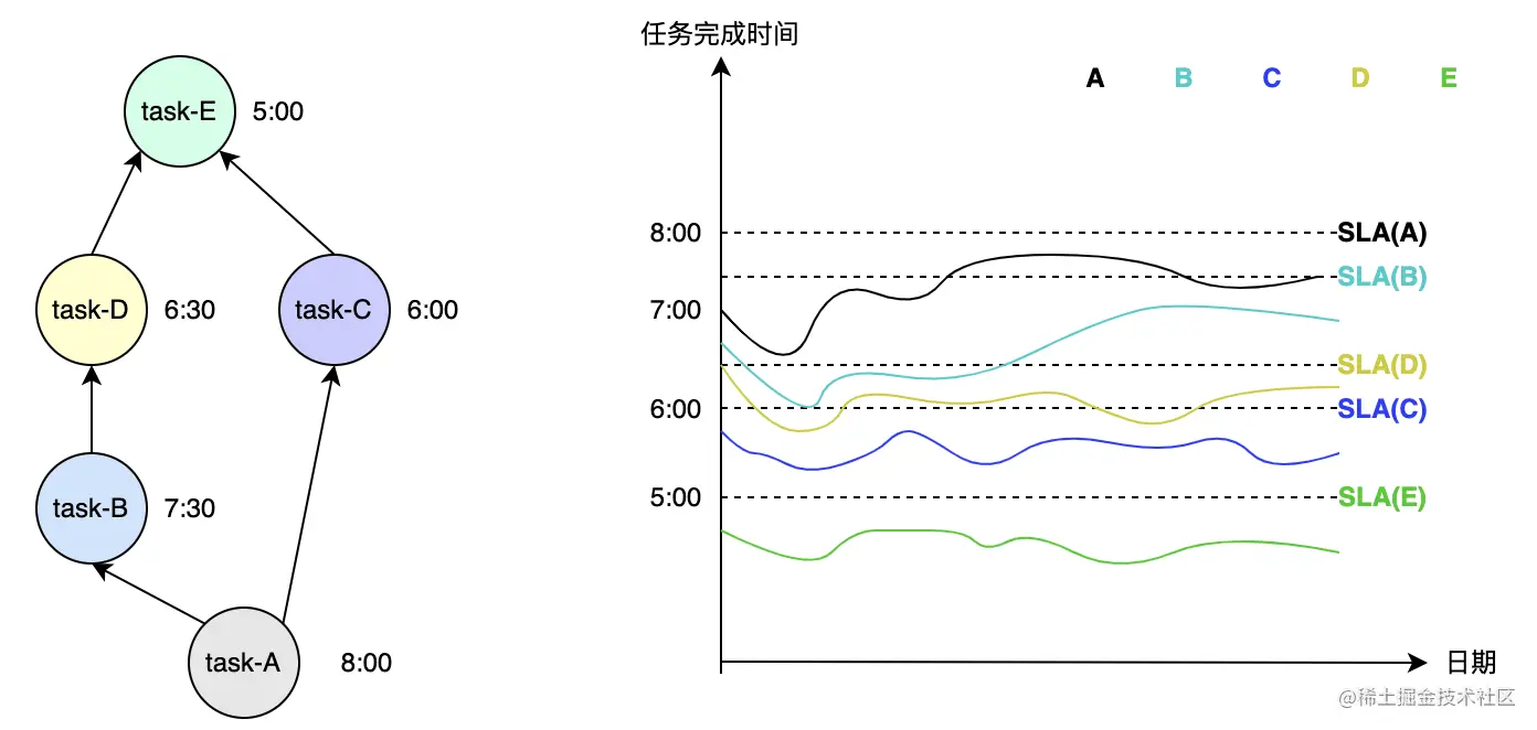 理想的一组任务的完成时间与对应SLA之间的关系如下图所示,即各个任务及其上游任务都在对应的SLA之前完成,这也是平台的治理目标。