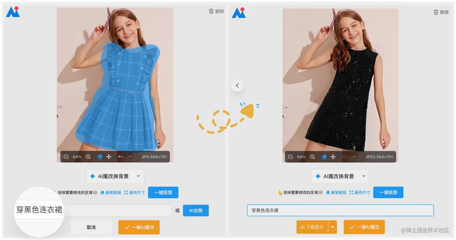 比如我想让图片上的小女孩换一件衣服,那就需要用橡皮擦涂抹裙子的区域,然后在下方输入框中输入【穿黑色连衣裙】,AI就能理解修改需求给小女孩穿上黑色的连衣裙,可以看到AI对图片细节的处理也是非常好的。