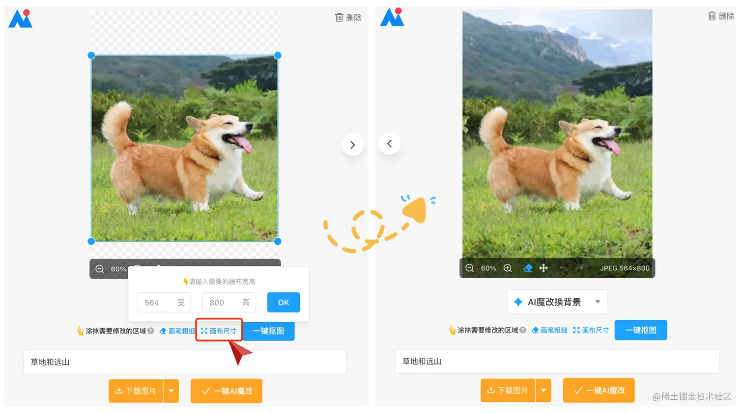 「AI魔改」也可以用来智能扩展图像尺寸,比如我们有时候找到一张不错的图像,但由于图像容器与图像的比例不同,因此在上传图像时,比例和尺寸会导致裁剪效果不佳,这时我们也可以通过改变【画布尺寸】调整画布区域,让AI填补空白来扩展图像,既能保留原始图像,也能拓展成新尺寸的图像。
