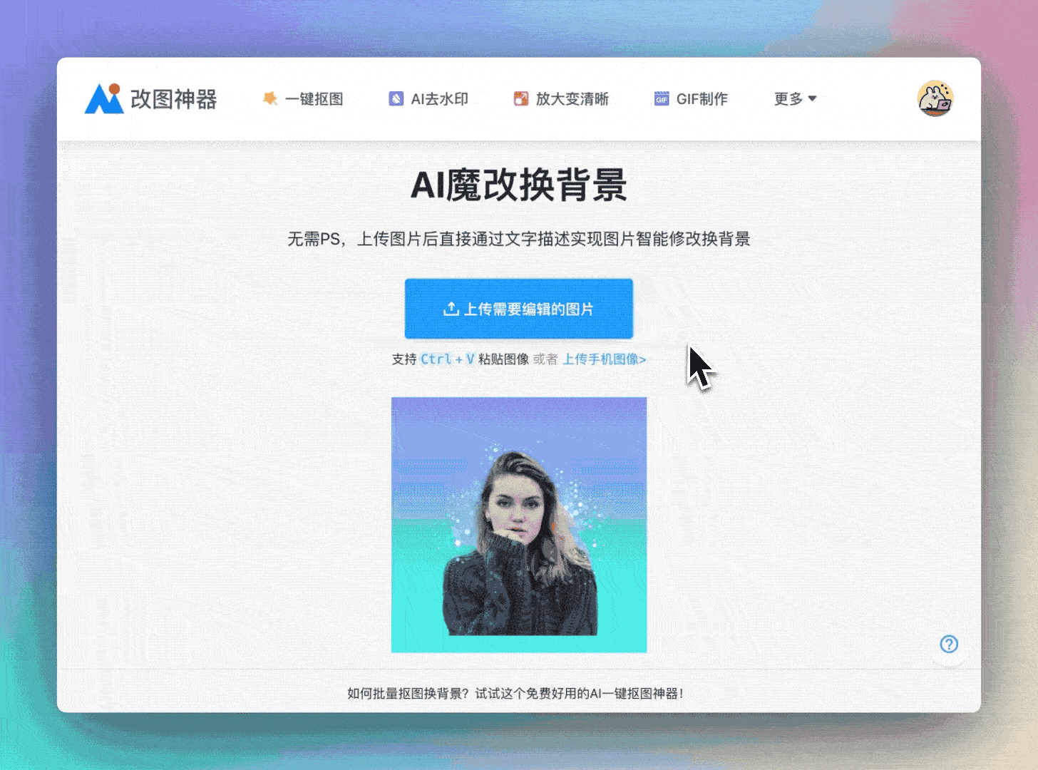 操作方法也非常简单,只需要上传你需要换背景的图片到「AI魔改」网页中,点击「一键抠图」,随后在下方输入框中输入你想要更换的背景描述即可。