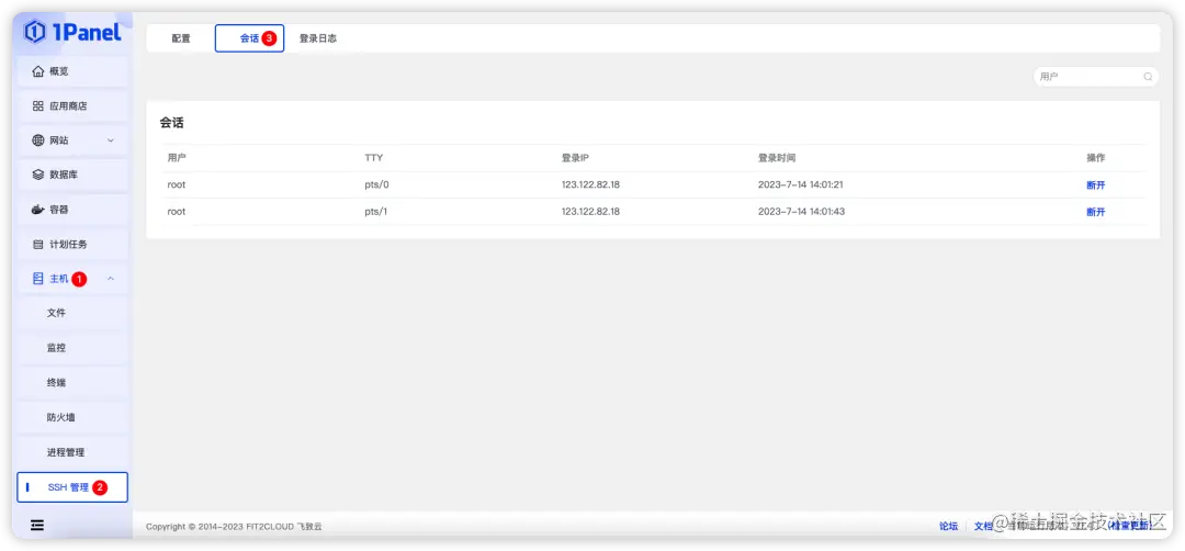 1Panel v1.4.0版本新增SSH会话管理功能。这一功能让用户能够更加高效、方便地集中管理和监控多个SSH会话,简化了SSH会话管理的操作流程,提高了工作效率。用户可以在一个界面上快速查看所有会话的状态,包括连接时间、用户和登录IP等。此外,SSH会话管理还提供了断线功能。