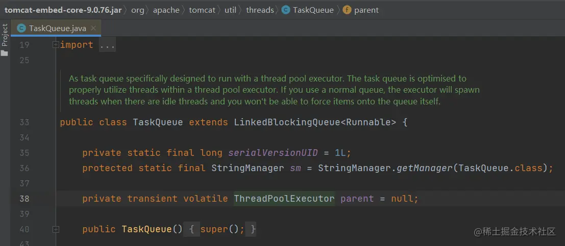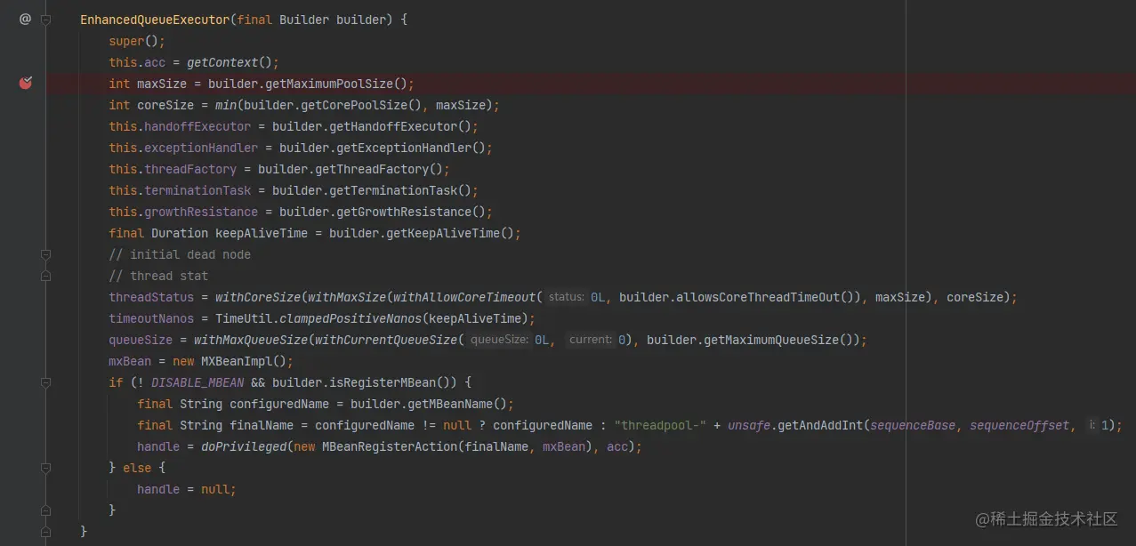 发现 EnhancedQueueExecutor 这个线程池,接着在这个类里面去找构建线程池时的参数。