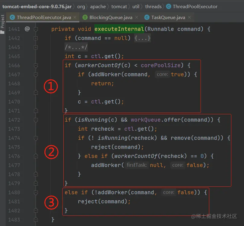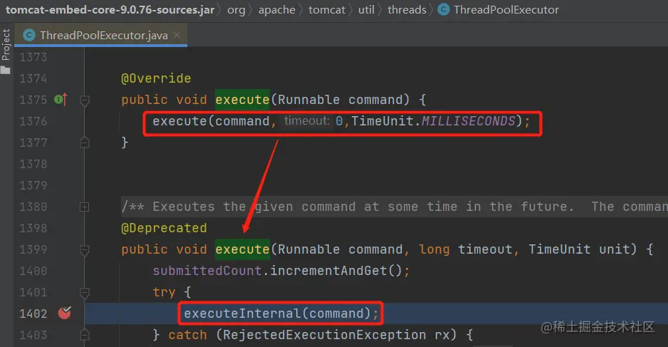 从这个调用栈中,由于我们要找的是 Tomcat 线程池相关的源码,所以第一次出现相关关键字的地方就是这一行: