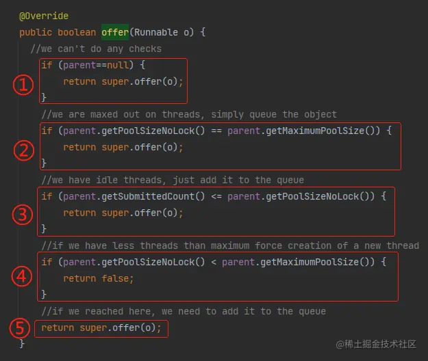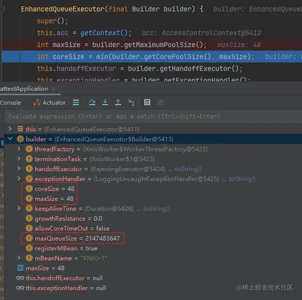 而 builder 里面,coreSize 和 maxSize 都是 48,队列长度是 Integer.MAX_VALUE。