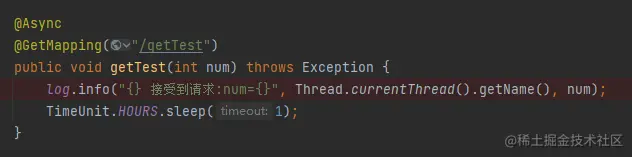 项目中的 TestController,里面只有一个 getTest 方法,用来测试,方法里面接受到请求之后直接 sleep 一小时。