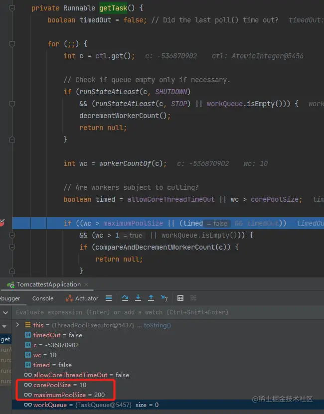 随着断点往下走,在 getTask 方法里面,可以看到关于线程池的几个关键参数: