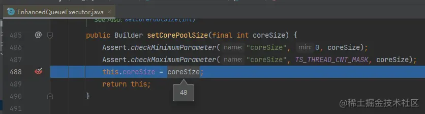 然后你会在它的 setCorePoolSize 方法处停下来,而这个方法的入参就是我们要找的 48: