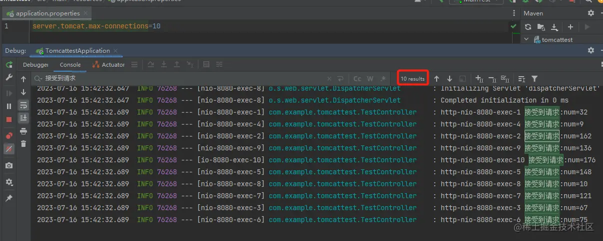那么其他什么都不动,如果我仅仅加入 server.tomcat.max-connections=10 这个配置呢,那么这个时候最多能处理多少个请求?
