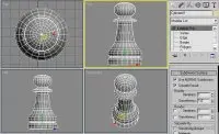 步骤 16转到顶点子关卡,选择棋子顶部的中心顶点并将其向上移动。选择(甚至看到)顶点可能有点困难,一种方法是放大顶部视口并在中心顶点周围绘制一个尽可能小的选择矩形,然后在棋子底部取消选择顶点。