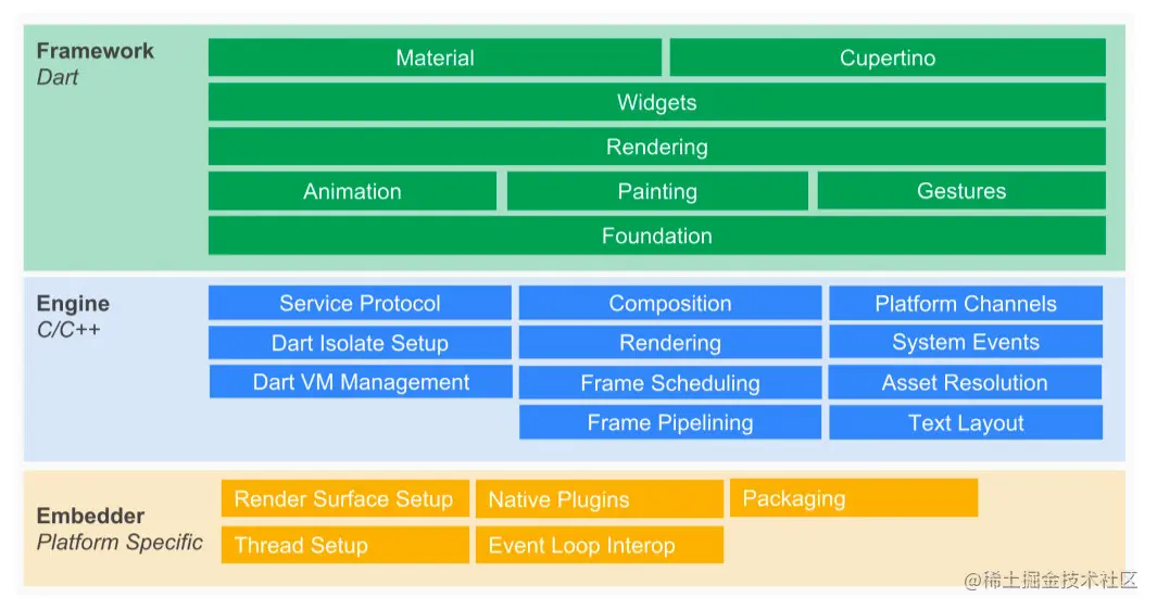 - Flutter引擎:主要用C++编写,它提供了低级渲染支持。它还负责插件系统、文本布局和类型设置、网络和文件 I/O、线程管理等。