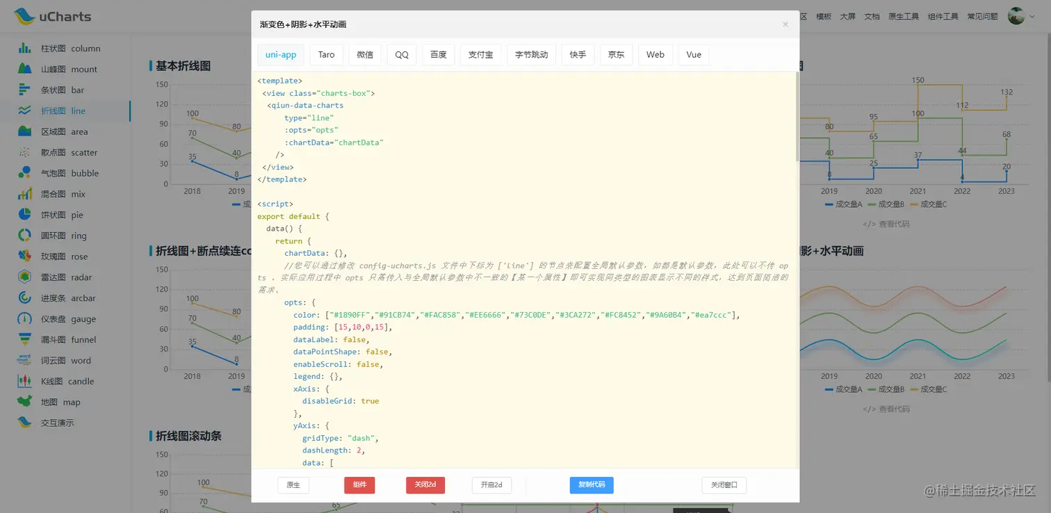 接下来,打开 ucharts官网的演示demo 点击查看代码,复制代码。