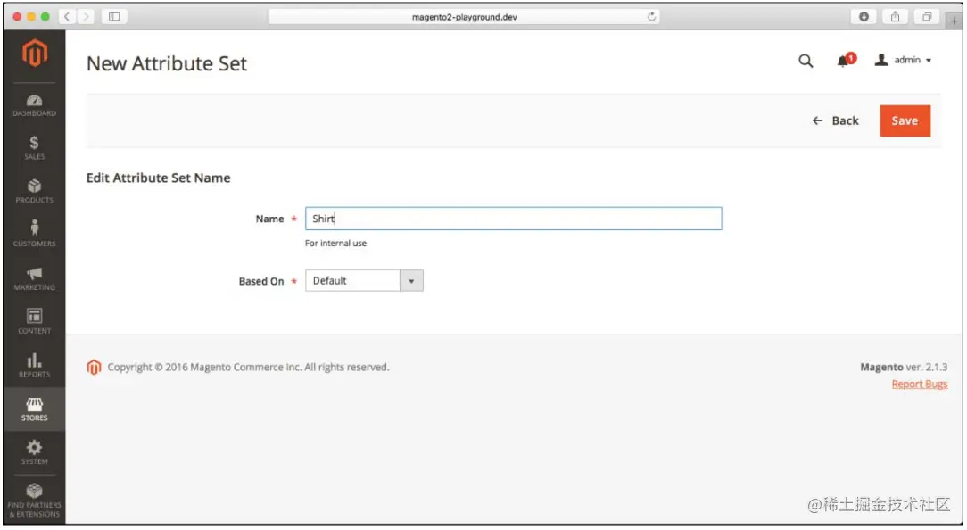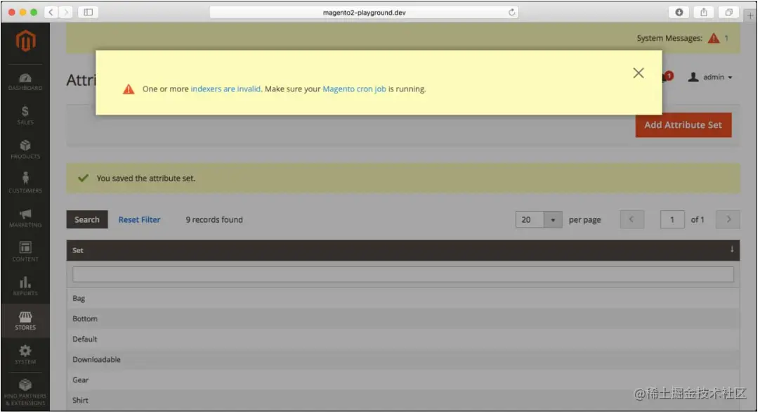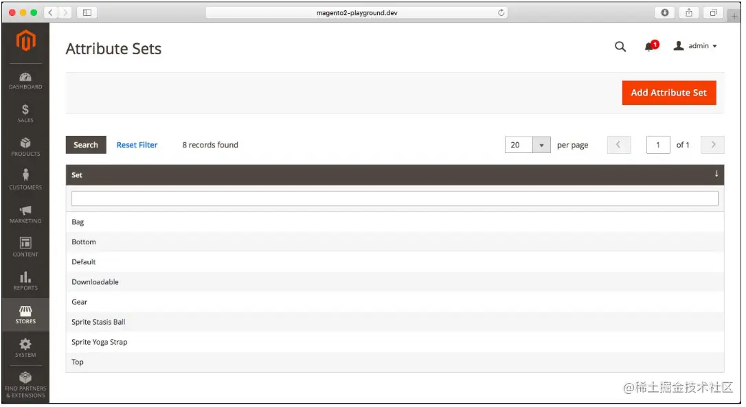 转到管理面板中的下一部分,Stores | Attributes | Attribute Sets,可以看到属性集列表,如图所示: