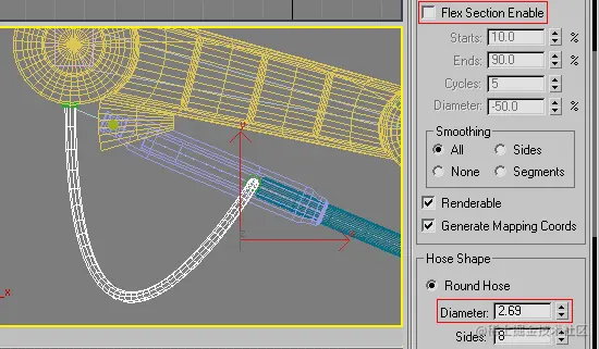当软管与气缸正确对齐后,再次单击软管,在“修改”选项卡上向下滚动,然后禁用“弹性截面启用”选项,如下图所示5l。同时将“软管形状”部分中的“直径:”值减小到小于圆柱体的值。