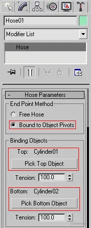 在命令面板的修改选项卡上,启用绑定到对象透视。单击“选取顶部对象”按钮,然后单击左侧圆柱体。单击“拾取底部对象”按钮,然后单击右侧圆柱体(或使用键盘上的 H 键)。