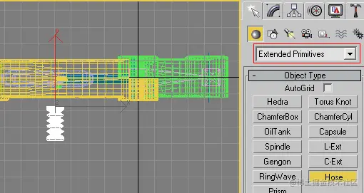 接下来,通过在命令面板的“创建”选项卡上选择“扩展基元”,单击“软管”按钮,然后在任何视口中绘制软管来创建软管,如下图所示 5j。不要担心它的大小、位置或形状。