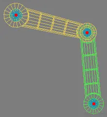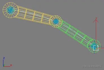 上图中的红点表示对象的枢轴。在您可以下载的场景中,我已经将它们移动到了正确的位置。UpperLeg的枢轴与Cylinder01的枢轴位于完全相同的位置,LowerLeg的枢轴与Cylinder02的枢轴位于同一位置。切换到顶视图时,它们都对齐。您添加的骨骼必须准确地在这些枢轴点开始或结束。