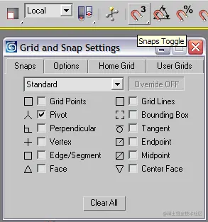 确保骨骼正确定位的一种方法是捕捉枢轴。使用此方法时,从顶部查看时,所有枢轴对齐也很重要。如果您的机器人中它们不是,并且对齐它们太复杂或太困难,您可以跳过以下捕捉设置,只需绘制骨骼,将它们全部选中并将它们移动到腿的中心(顶视图)。要使用捕捉设置,请右键单击主工具栏上的捕捉切换按钮,然后选择枢轴并在必要时清除其他按钮(见图 3b)。现在点击 捕捉 再次切换按钮(用鼠标左键)启用它。