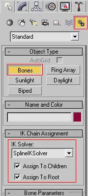 单击命令面板的“创建”选项卡上“系统”部分中的“骨骼”按钮,如下图所示 3c。选择“样条线IKSolver”作为“IK 求解器”并启用“分配给子级”(如果您愿意,可以使用其他 IK 规划求解器,也可以根本不使用任何规划求解)。