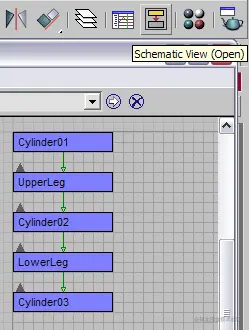 当您确定枢轴位置正确时,选择 Cylinder01 并将其链接到 UpperLeg。选择“圆柱 02”并将其链接到“小腿”,并选择“圆柱 03”并将其链接到“小腿”。要将一个对象链接到另一个对象,请单击主工具栏上的“选择并链接”按钮,选择要链接的对象,然后拖动到要链接到的对象。如果操作正确,您链接到的对象将闪烁一次白色。