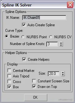 当下面图 3e 所示的样条曲线 IK 求解器对话框打开时,只需单击“确定”。