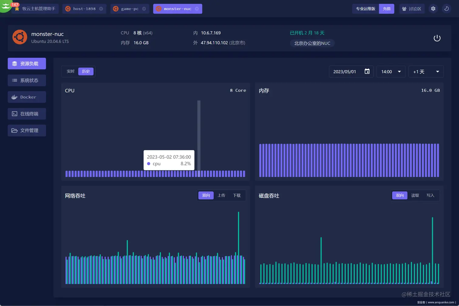 而且用户的需求也发生了改变,从单一的远程连接或建站变成了多云主机统一管理,家庭服务器无公网管理,资源使用监控告警,应用快速部署,Web Terminal,不需要开 22 端口。而且还要轻量级,不能占用服务器太多资源。 新生代:牧云 - 主机管理助手