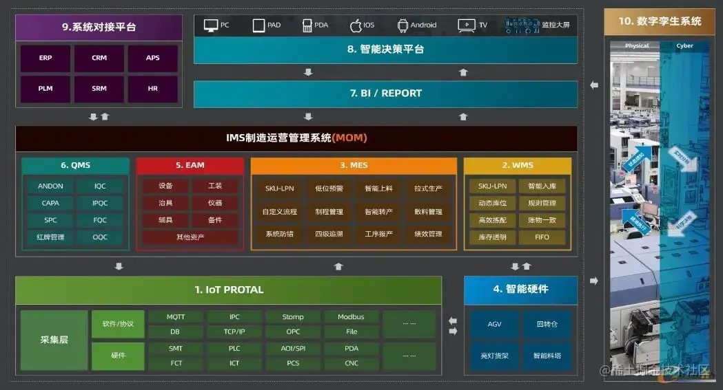 MES (Manufacturing Execution System)是制造执行系统,是一套面向制造企业车间执行层的生产信息化管理系统。主要集中在生产过程管控,向上与ERP、PLM等系统进行对接,横向与WMS、QMS等系统进行对接,向下与设备进行对接。其共分为基础设置、计划排程、质量管理、订单管理、追溯查询、工位端、报表分析7大模块。