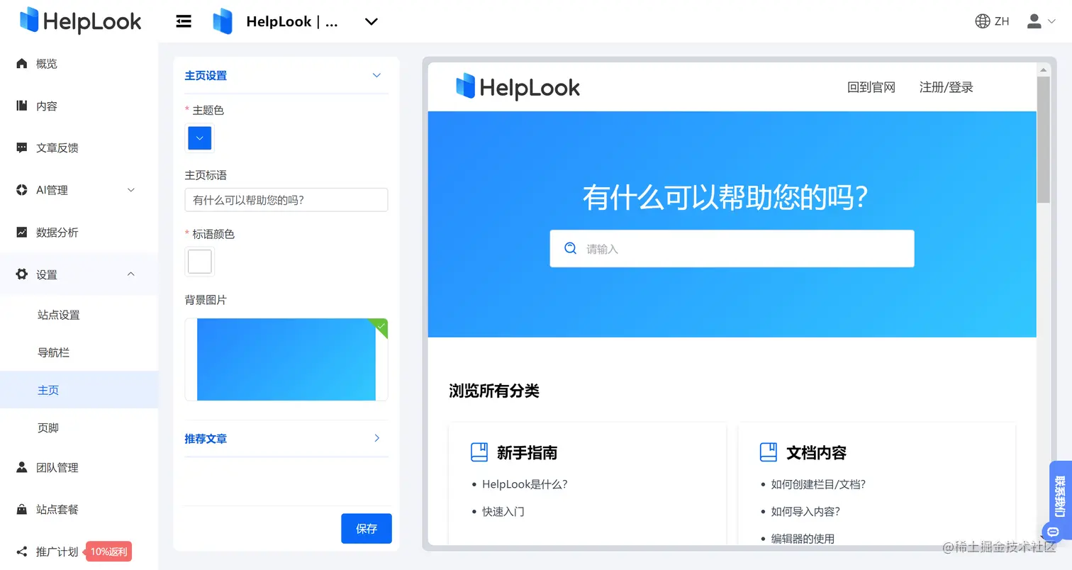 以HelpLook为例,可以进行知识库主页、导航栏、页脚的标签、logo、颜色、背景等自定义设置,充分给予使用者自行发挥的空间,如果你想为你的企业打造一个知识库,这里的个性化定制功能完全符合你的要求。