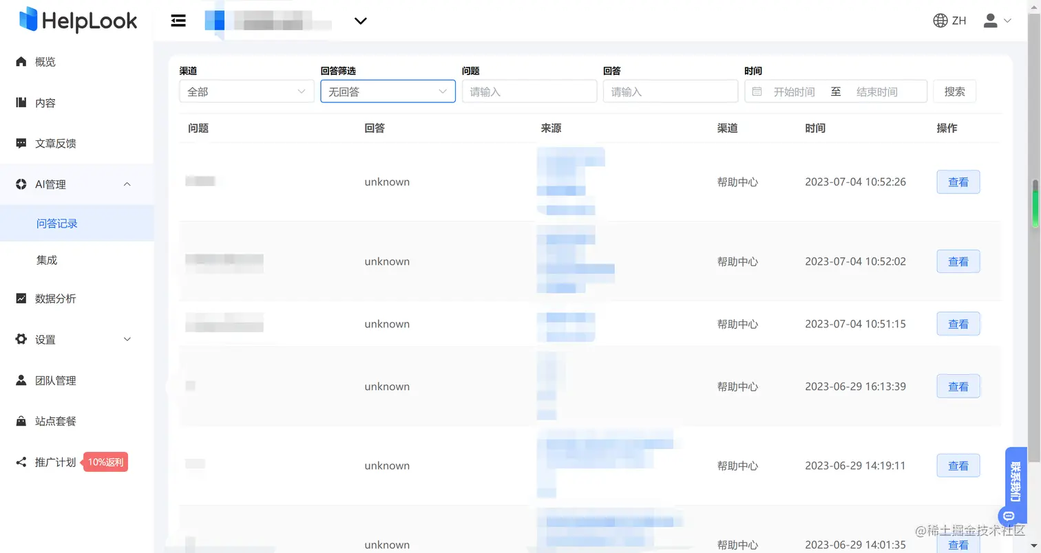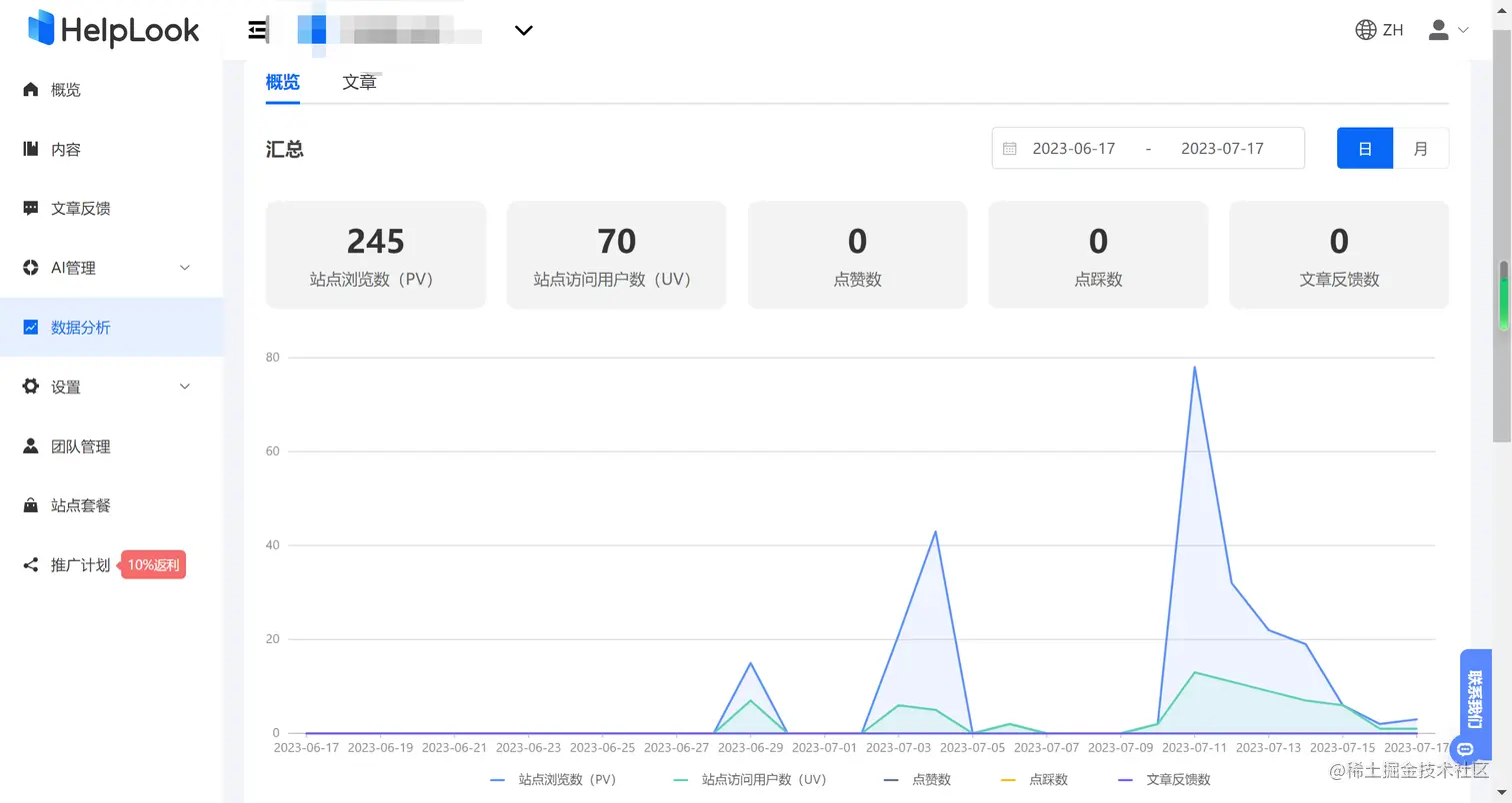 如图,以HelpLook为例,你可以跟踪并分析你的站点浏览数以及访问用户数。了解有多少用户访问你的知识库是非常重要的。这可以告诉你知识库的兴趣程度和使用频率。跟踪访问量可以帮助你了解用户对知识库内容的需求,并根据需求进行相应的优化和更新。