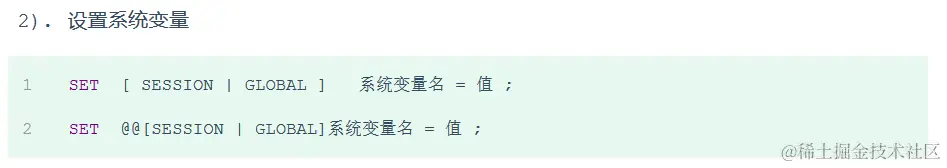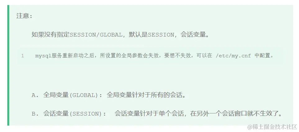 系统变量是 MySQL 服务器提供的,属于服务器层面。分为全局变量( GLOBAL)、会话变量( SESSION)