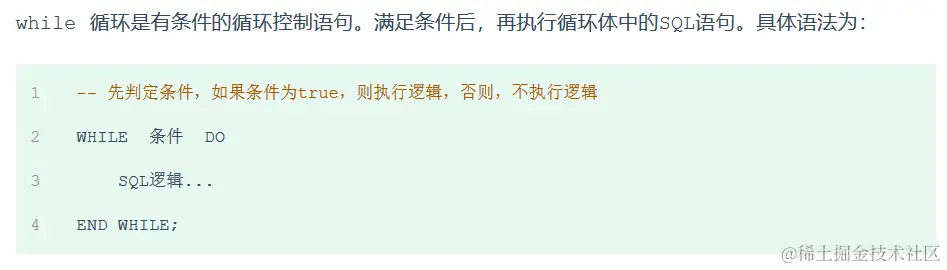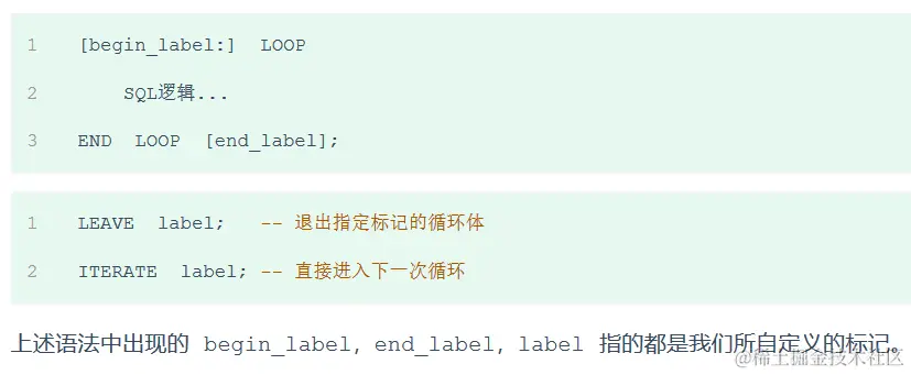 LOOP 实现简单的循环,如果不在SQL逻辑中增加退出循环的条件,可以用其来实现简单的死循环。 LOOP 可以配合以下两个语句使用: ☀️ LEAVE :配合循环使用,退出循环。 ☀️ ITERATE:必须用在循环中,作用是跳过当前循环剩下的语句,直接进入下一次循环。