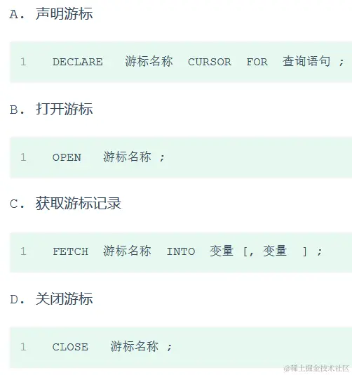 - 游标的使用包括游标的 声明、OPEN、FETCH 和 CLOSE