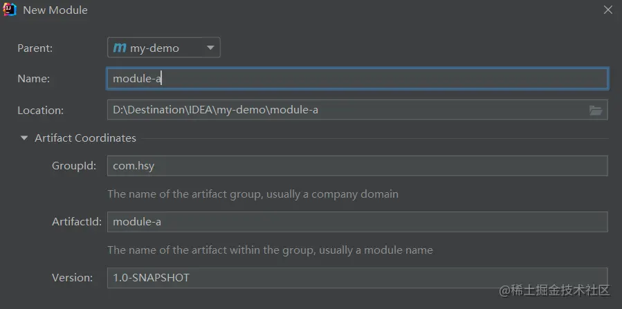 <artifactId>module-a</artifactId> <!-- 建子项目时填的,建完自动生成 -->