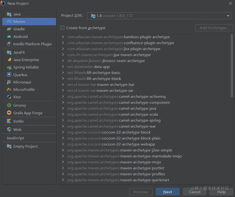 左侧选中Maven,确定java版本后下面不打任何勾,直接点击next,出现如下页面。