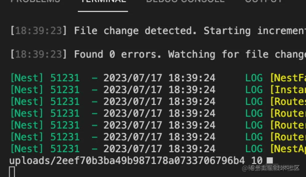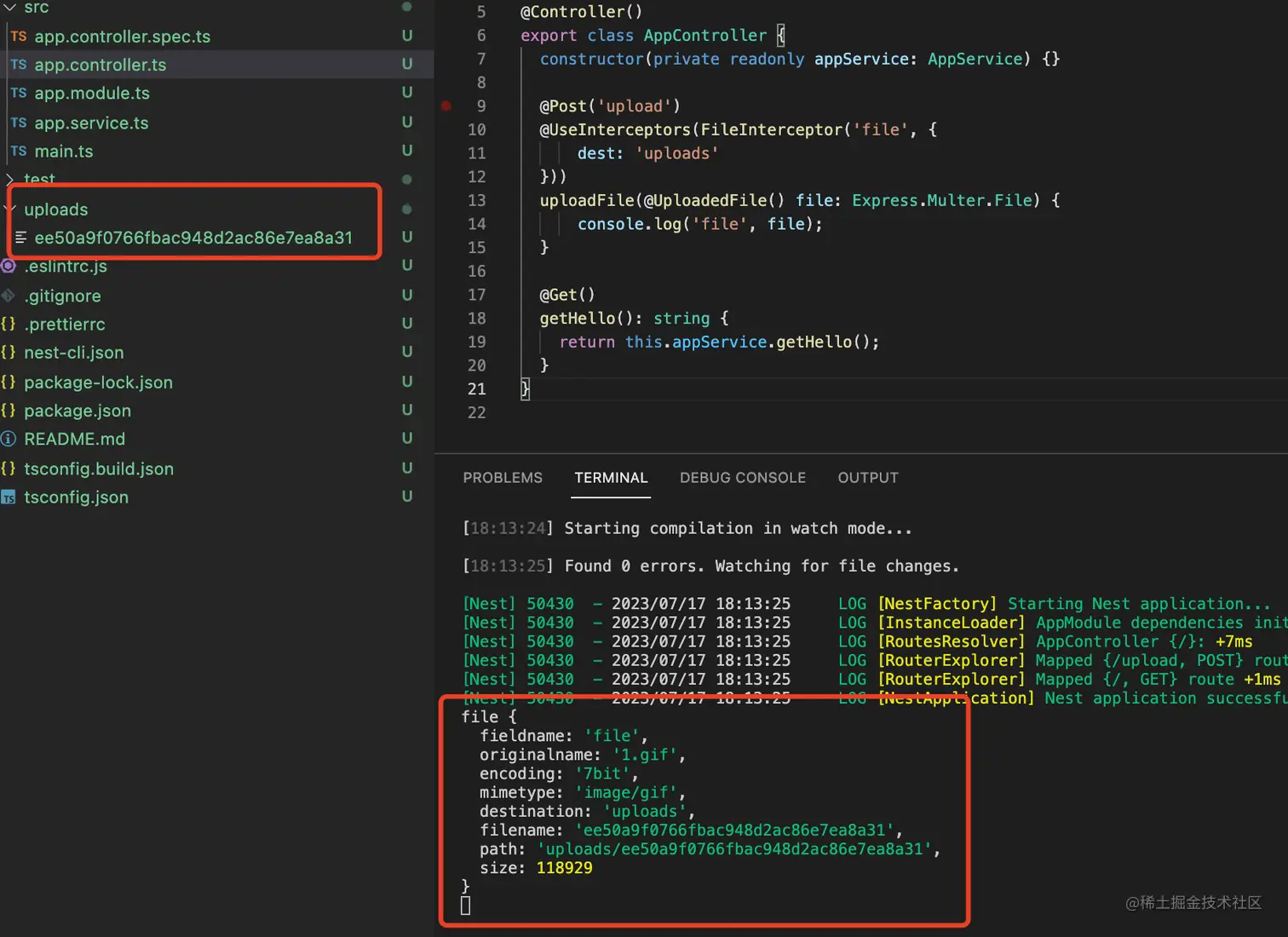 提示文件上传成功了,然后在服务端控制台也打印了文件信息,并且在 uploads 目录下可以看到这个文件: