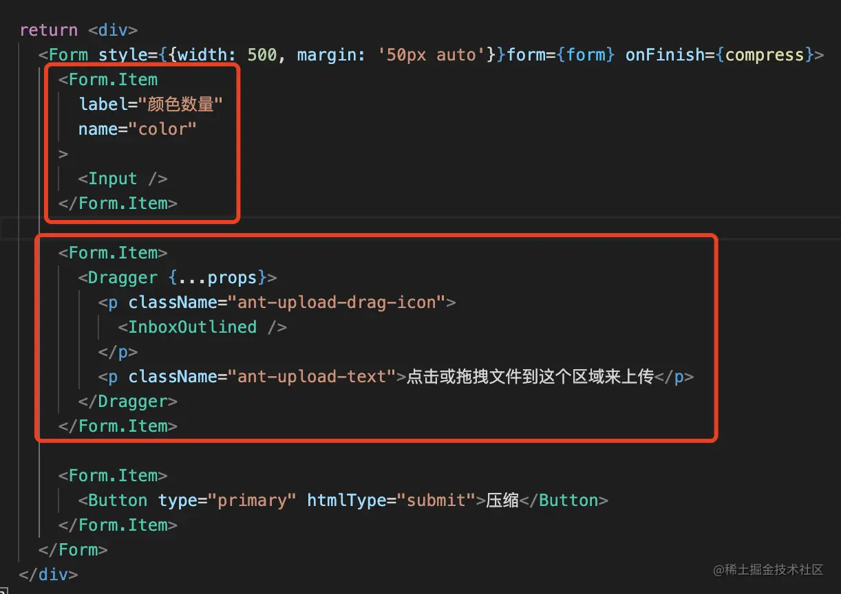 <Form style={{width: 500, margin: '50px auto'}}form={form} onFinish={compress}>