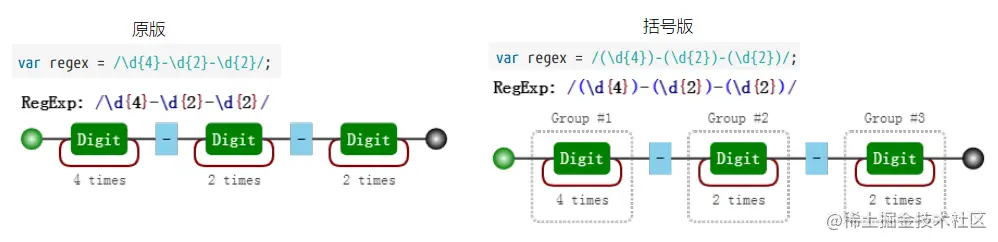 对比这两个可视化图片,我们发现,与前者相比,后者多了分组编号,如 Group #1,这样正则就能在匹配表达式的同时,还能得到我们想要从匹配项中捕获的分组内容。即用 () 括起来的内容。到此为止,t(e)(st(\d?))涉及到的分组捕获知识点也就结束了。