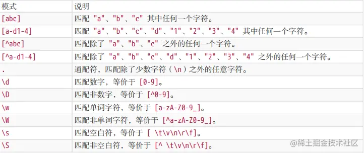 如果字符组里的字符特别多,可用连字符 - 来省略和简写(见表格示例)。