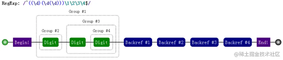 针对 "1231231233".match(/^((\d)(\d(\d)))\1\2\3\4$/) 的可视化形式如下,一目了然: